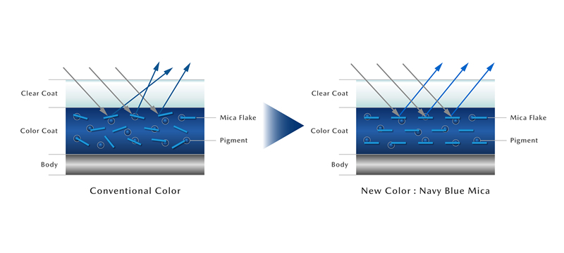 El objetivo era crear un azul estándar que superara al popular Azul Cristal Profundo, combinando distintos tipos de mica para lograr un acabado de alta definición, con gran contraste y una apariencia viva bajo la luz del día, pero profunda y elegante en condiciones de baja iluminación.