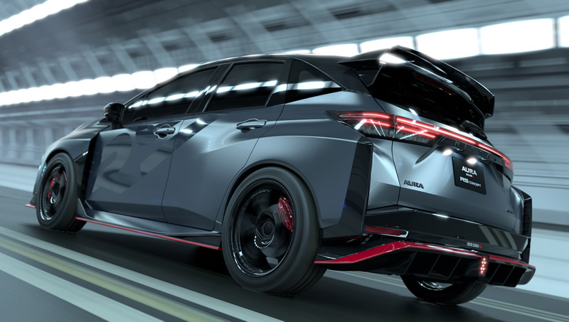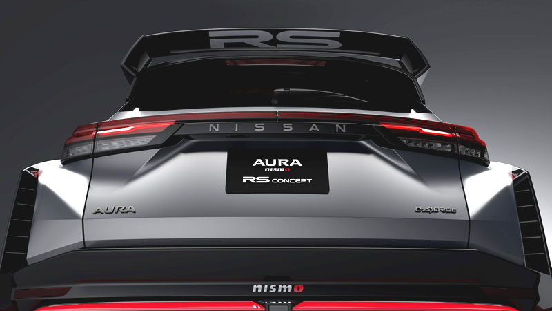 El Aura NISMO RS Concept desarrolla el lenguaje ''Agile Electric City Racer'' hacia una estética más musculosa y orientada a la competición. La carrocería incorpora guardabarros ensanchados en 145 mm y una reducción de 20 mm en la altura, configurando una postura más baja y agresiva que favorece el centro de gravedad.