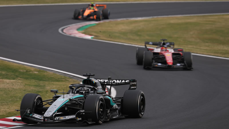 Vuelta 45: Russell a 0.5s de Leclerc por el P3. Hamilton bloquea y se pasa en la chicana. Norris que está atrás, pide que le de la posición.